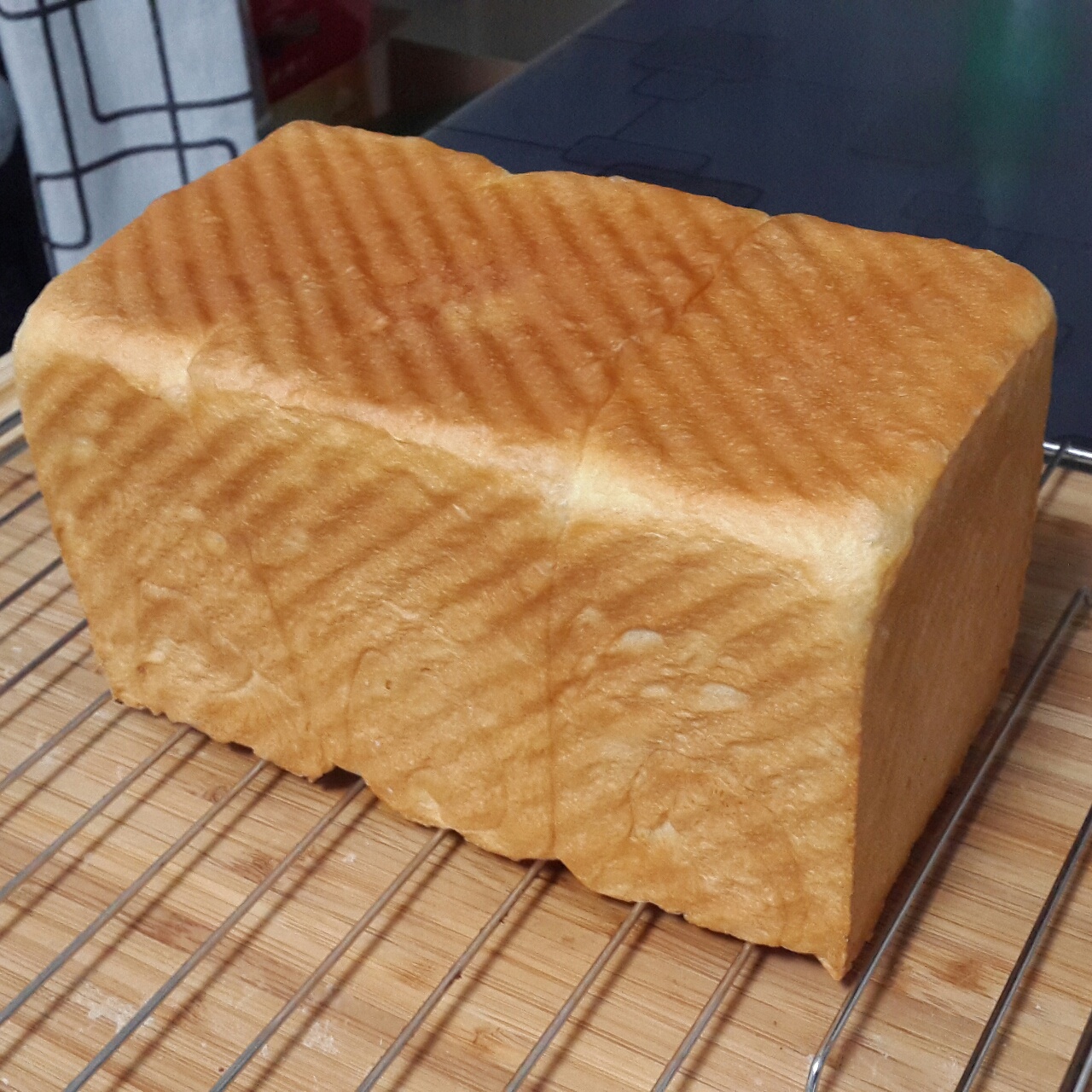 换了100g全麦粉,20g炼奶~没有发酵箱,二发在温暖环境下加盖湿布大概2个多小时,成功满模~