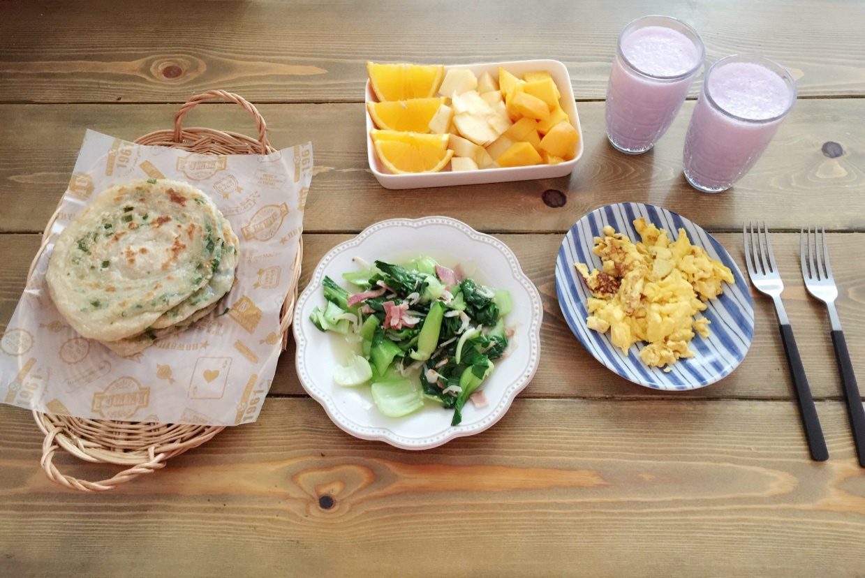 葱油饼,炒鸡蛋,青菜炒培根虾皮,紫薯牛奶