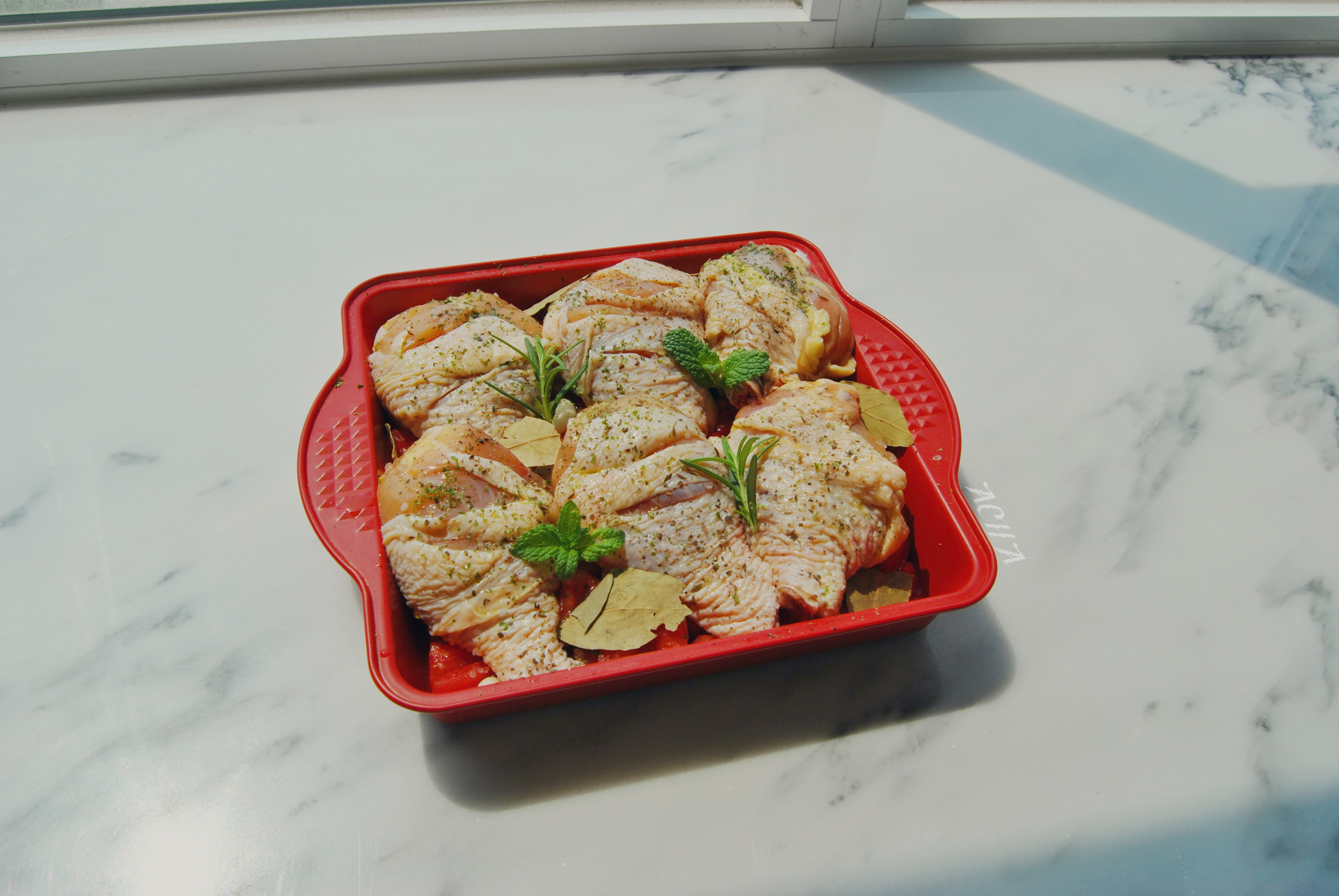 ACHA 做过 香蒜蕃茄烤鸡腿 入烤箱前~超级快手。 新鲜柠檬薄荷、胡椒薄荷、迷迭香; 干罗勒、欧芹、百里香、莳萝、香叶; 海盐、胡椒、大蒜、番茄; 啊,光想一想就迫不及待呢。 香料真是人间圣物啊。 2015-05-02