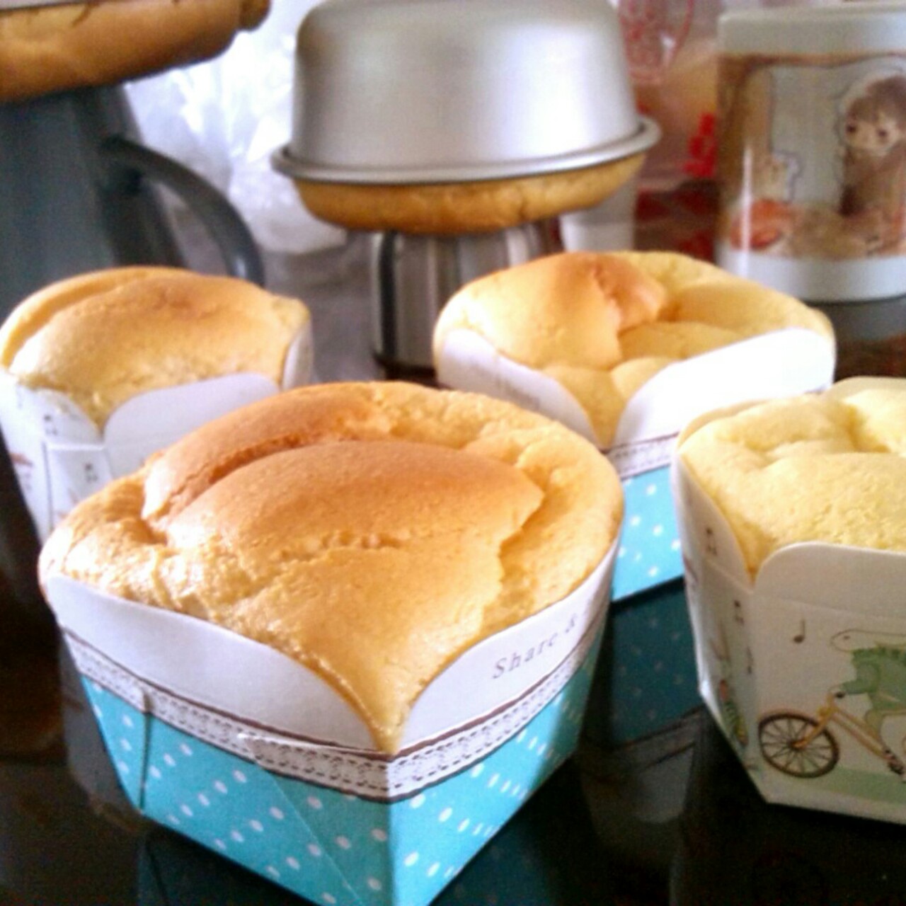 naki25 做过 榴莲戚风蛋糕 被方子的蓬松度震惊,果然轻盈的分蛋面糊还再加泡打粉的威力不可限量,做出6寸大爆头一个+四寸小爆头2个+如图纸杯4个,靠后完全不塌陷不回缩,减油30换成牛奶、减糖40、减榴莲20(因为肉不够囧哈哈),淡淡的甜味正好!比较喜欢清淡口~ 2015-05-06
