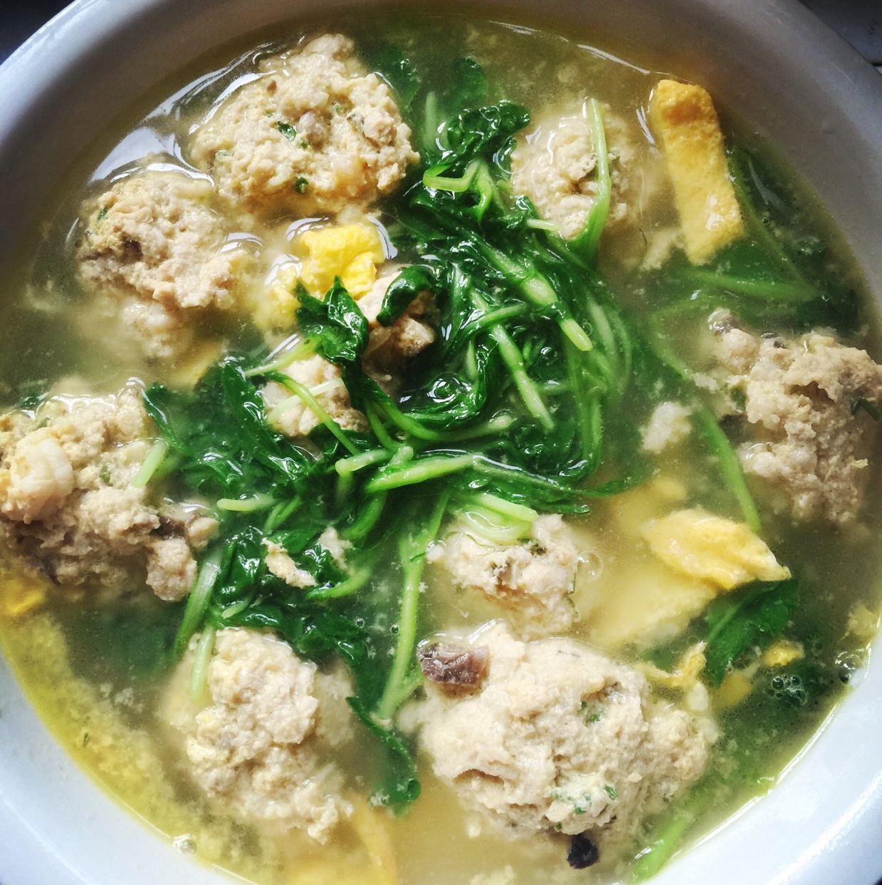 我加了蛋皮丝,丸子里加了虾仁,还有婆婆自家种的鸡毛菜,味道鲜啊……