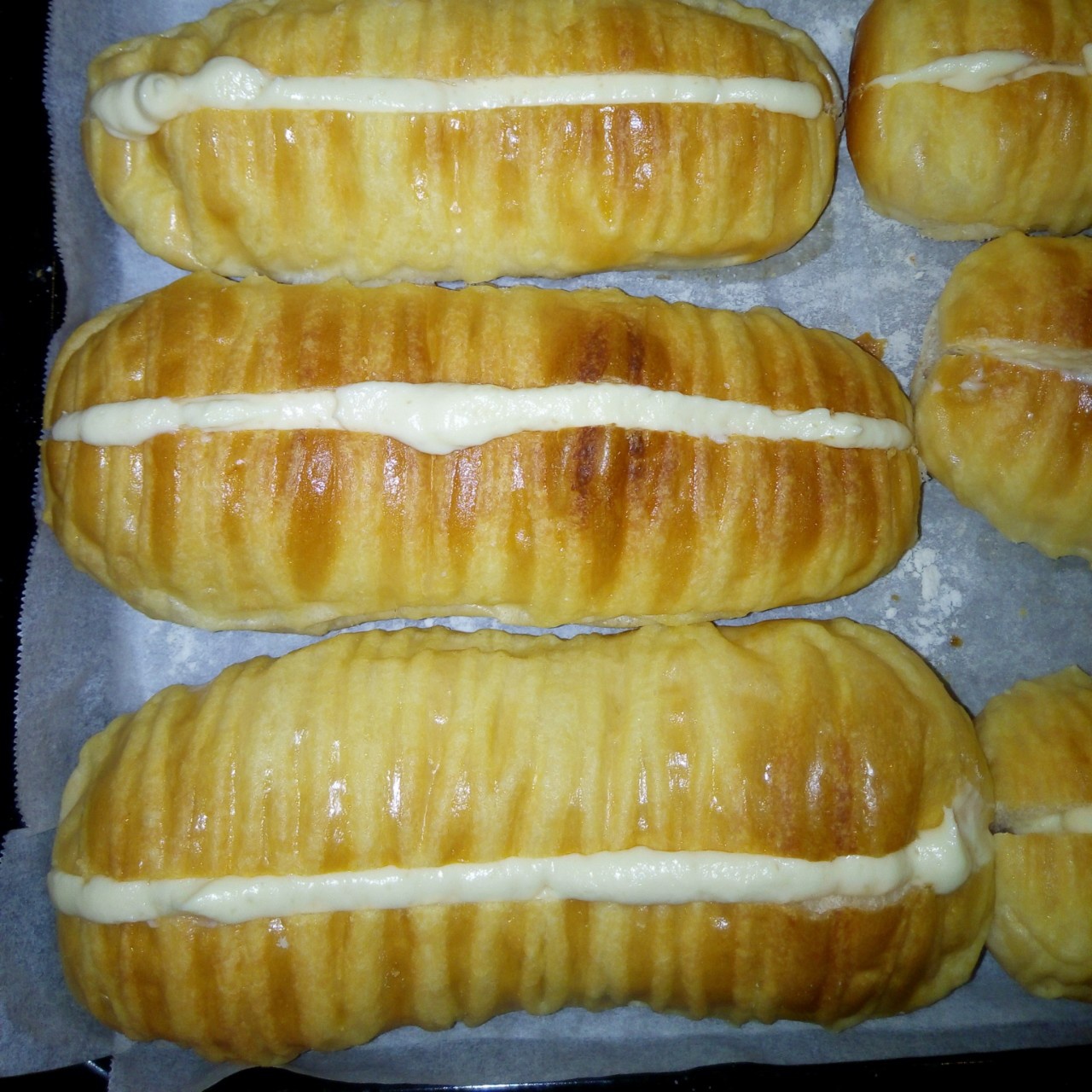 痴亻言兌夢 做过 鲜奶雪露面包 做得好丑啊!烤完拿出来会有点回缩~按方子的分量来的,分了八个,做出来一个面包也蛮大个的~夹馅好吃,偏甜了,面包不甜,刚好中和下#早餐•2015年5月17日# 2015-05-17