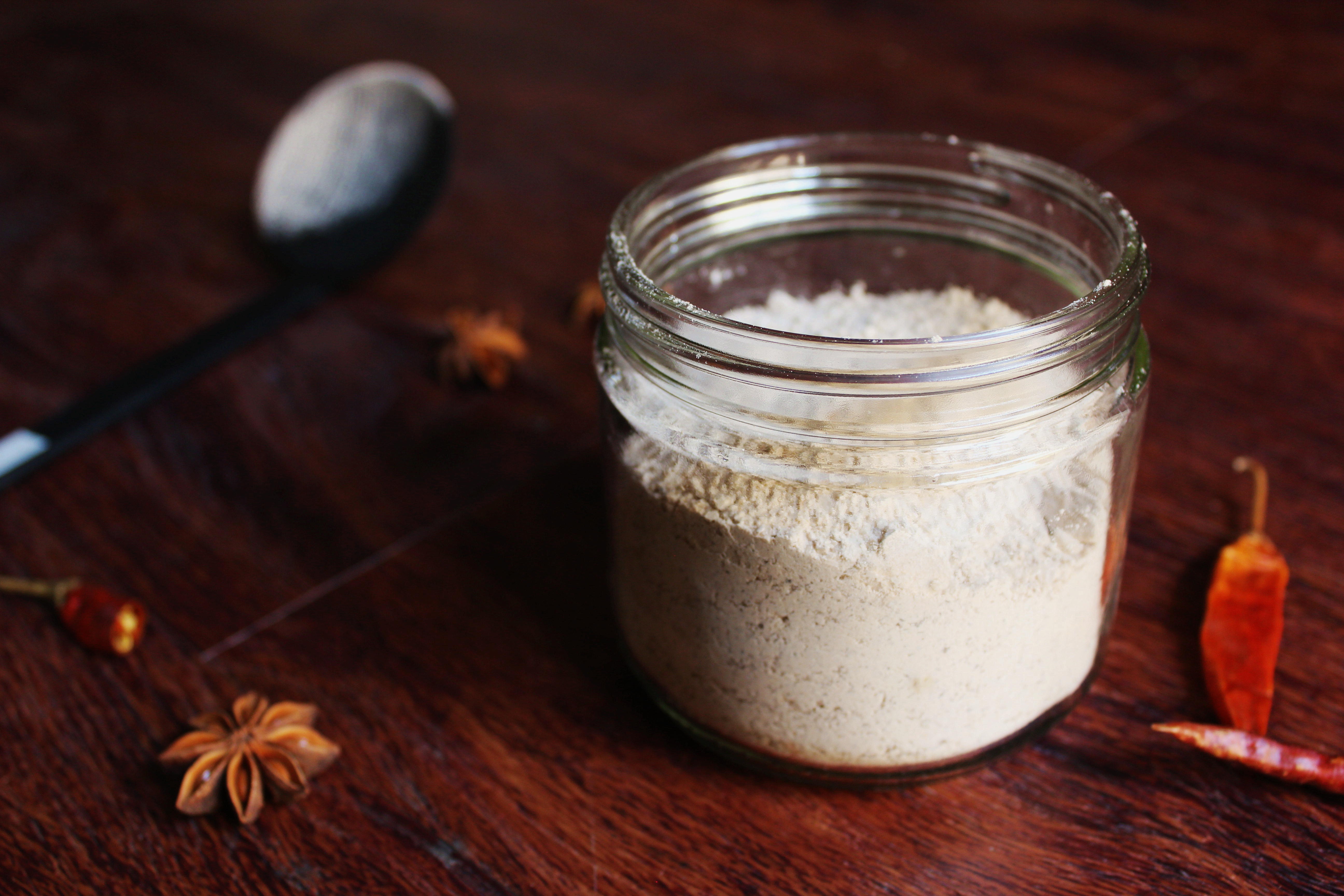 干辣椒 盐酥鸡料 粗盐 八角~ 炒香了拿料理棒打碎 把机器内壁都打花了 好心疼 TAT 做了一大瓶 以后再腌东西就随拿随用咯~