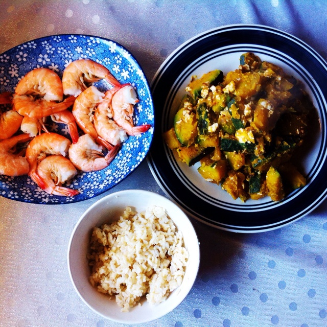 蒸虾,咸鸭蛋南瓜,糙米饭。