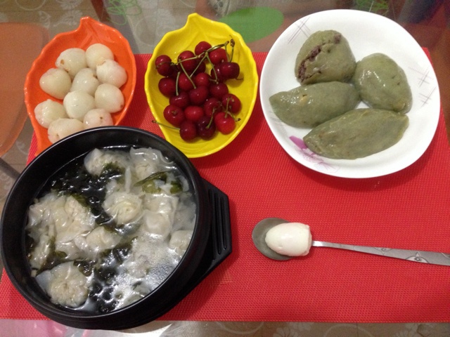 儿子早餐,西葫芦肉馅馄饨,清明果,土鸡蛋,好小一个,水果,樱桃,荔枝!