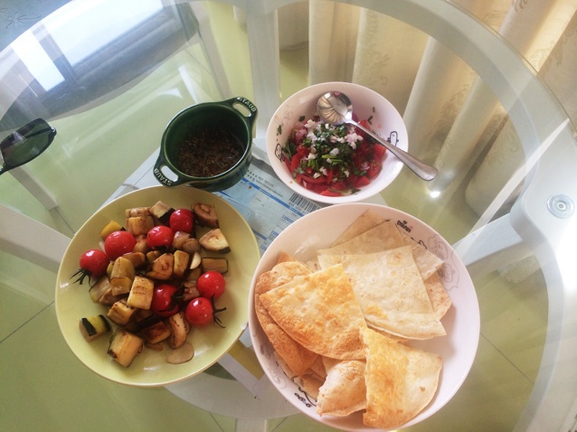 乳酪薄饼配蔬菜沙拉,再配以自制意大利青酱酱汁,美美哒午餐。
