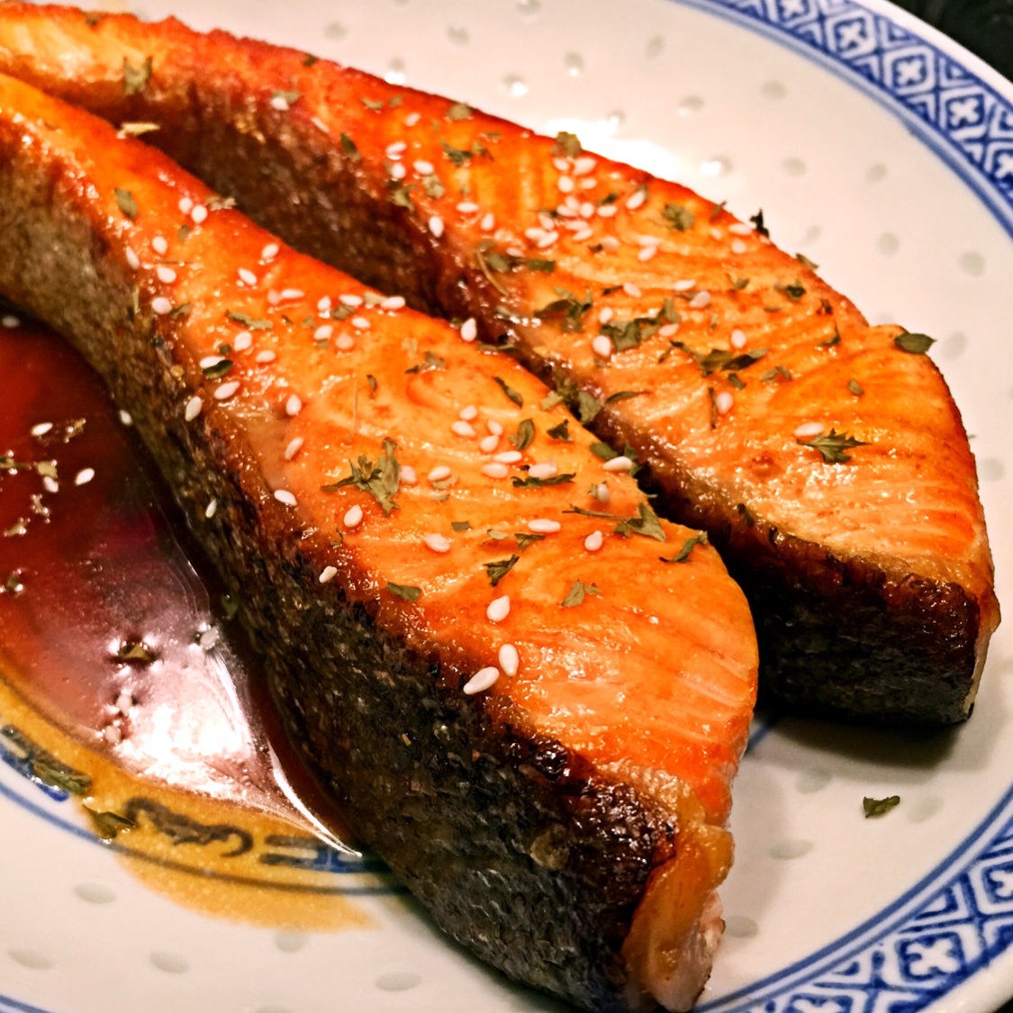 用了米酒海鲜酱油和蜂蜜调成酱汁,鱼肉煎好后皮脆脆肉嫩嫩的,还很入味,非常好吃(๑╹ڡ╹)╭最后还撒了干parsely和芝麻