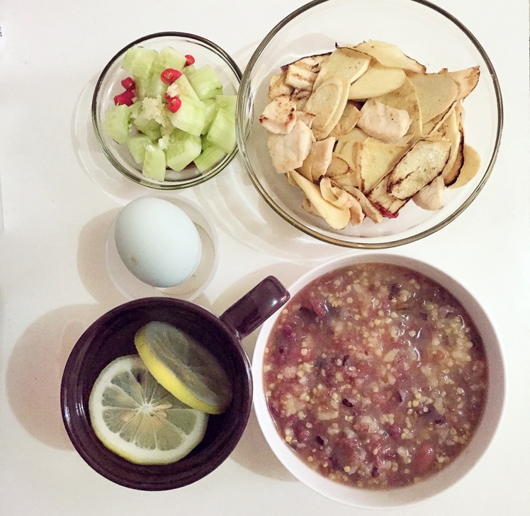 鸡肉炒茭白、超小份拌黄瓜、咸鸭蛋、杂粮粥