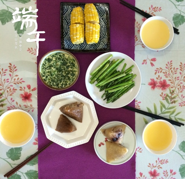 端午节的早饭,粽子,芦笋,蒸蛋,玉米,南瓜汤。