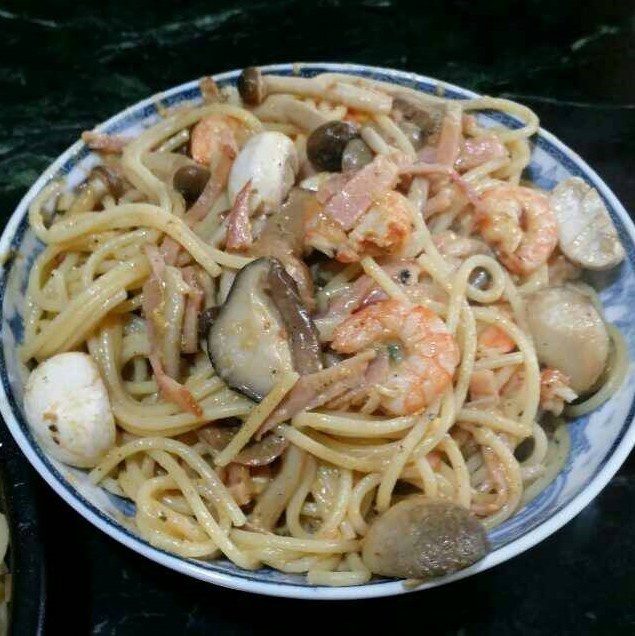 芝士杂菇火腿虾仁炒手工面