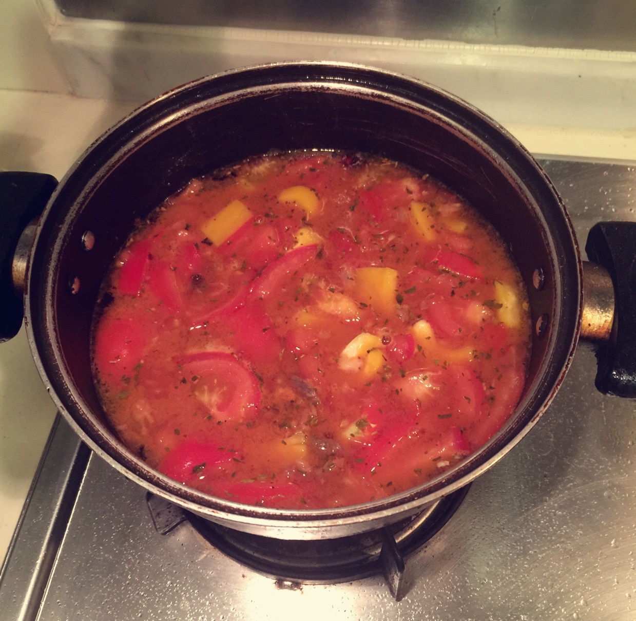 宵夜 在炖 加了点欧芹 牛至叶 还有彩椒 香