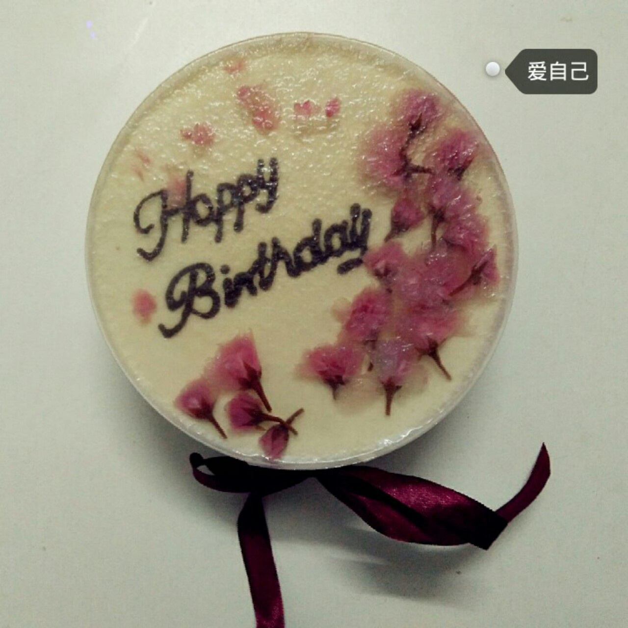 做的是榴莲慕斯,字写上去做镜面不会飘,就是放好樱花再放冰箱的时候会移位,我打开冰箱门再整理下才行!