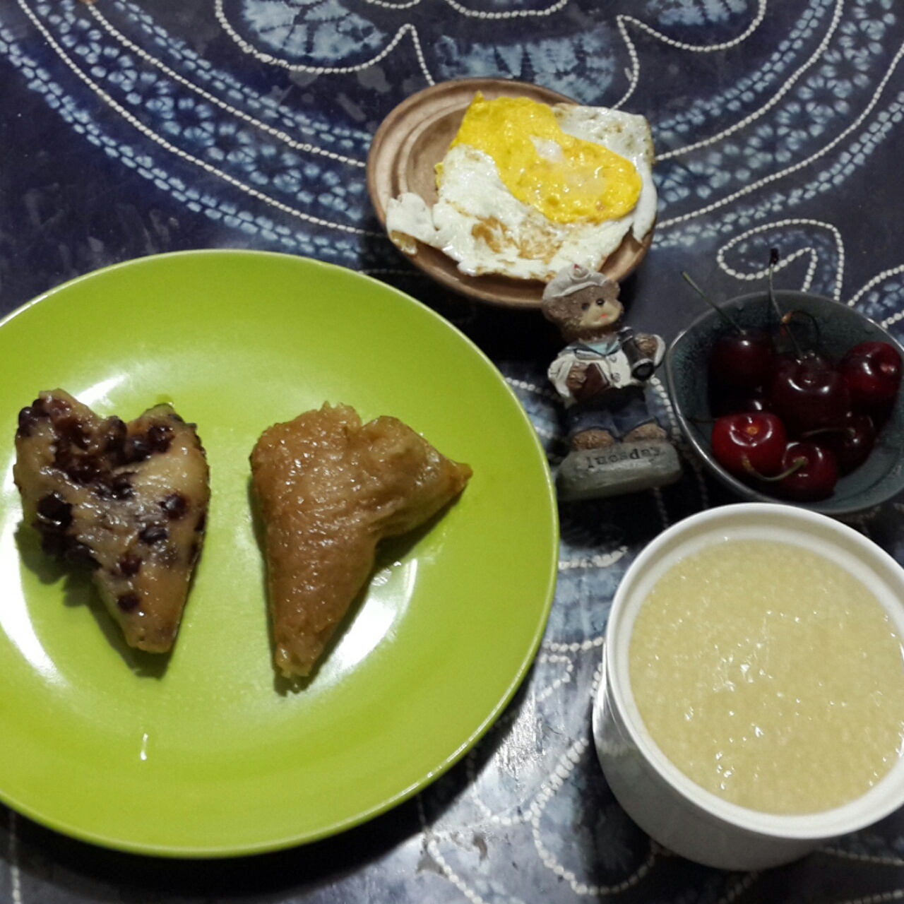 红豆粽+肉粽,煎蛋,樱桃,小米粥