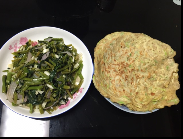 第一次炒空心菜。西葫芦饼有史以来第一次做的这么好吃