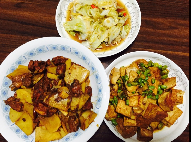 红烧豆腐,土豆炒鸡,糖醋包菜。
