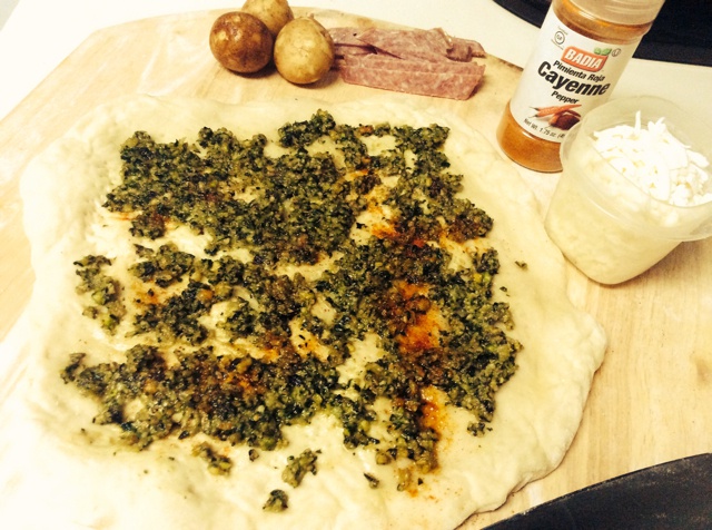 Yuaner 做过 意式青酱(开心果少油快手版) Pastachio Pesto Sauce 给大家看看还没放芝士和别的材料的pesto pizza.我家爱吃辣,所以还撒了辣椒粉。乡村风青酱披萨,不需要擀圆,随意整形更有食欲。喜欢的可以做做这个少油健康版青酱烤Pizza吃。 #早餐•2015年7月8日# 2015-07-08