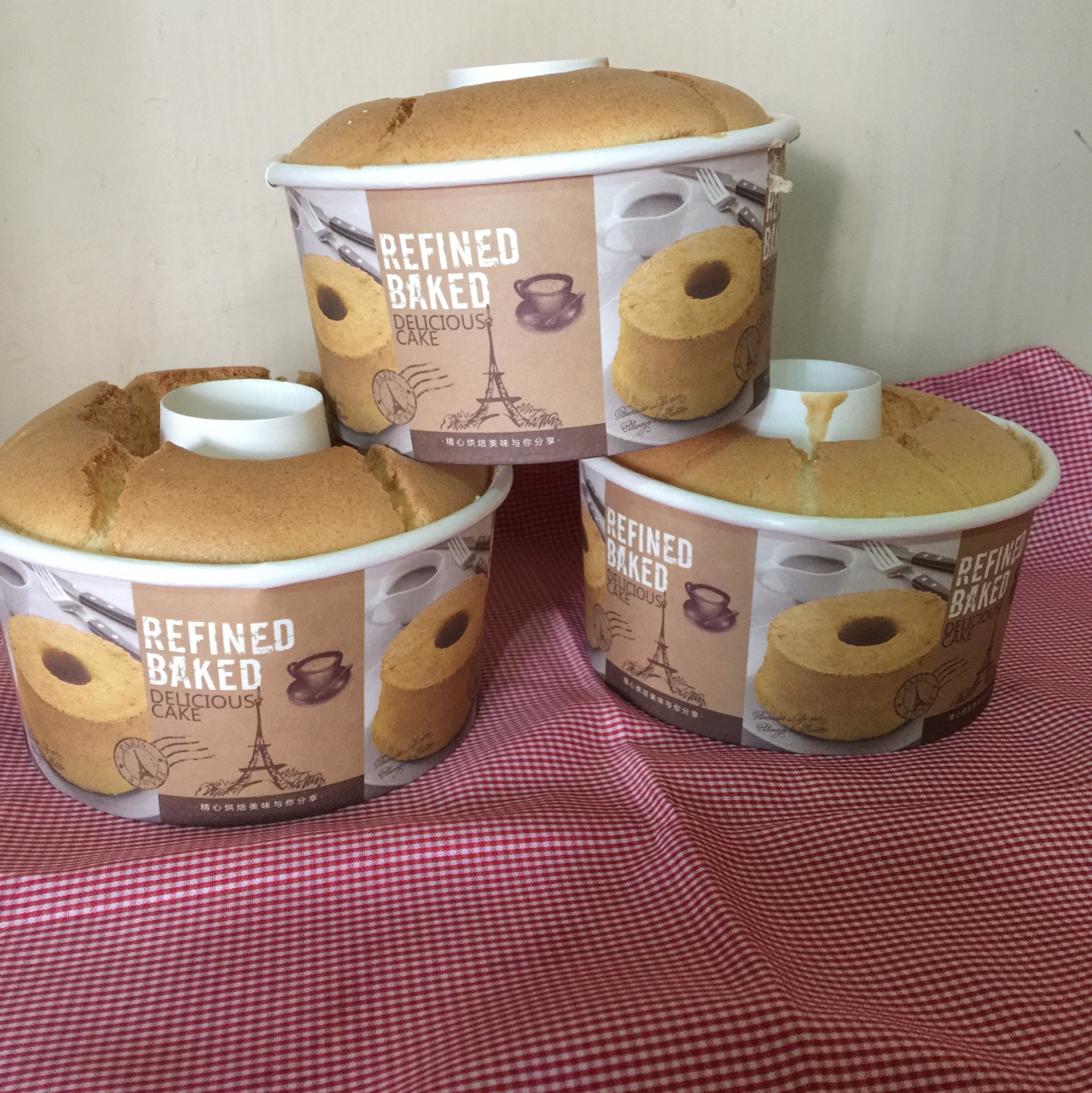 下厨房买的中空四寸的盒子,8寸的戚风量做了3个这个外加3个纸杯,这样打包送人也很赞呢