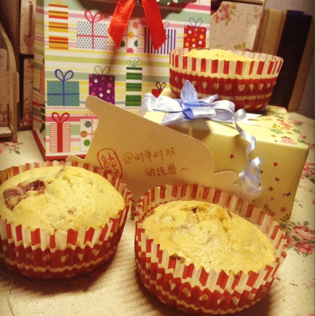 我用的自己做得玫瑰酱~~味道不错,就是不知道怎么回事似乎每次做马芬的心儿都不是很松软