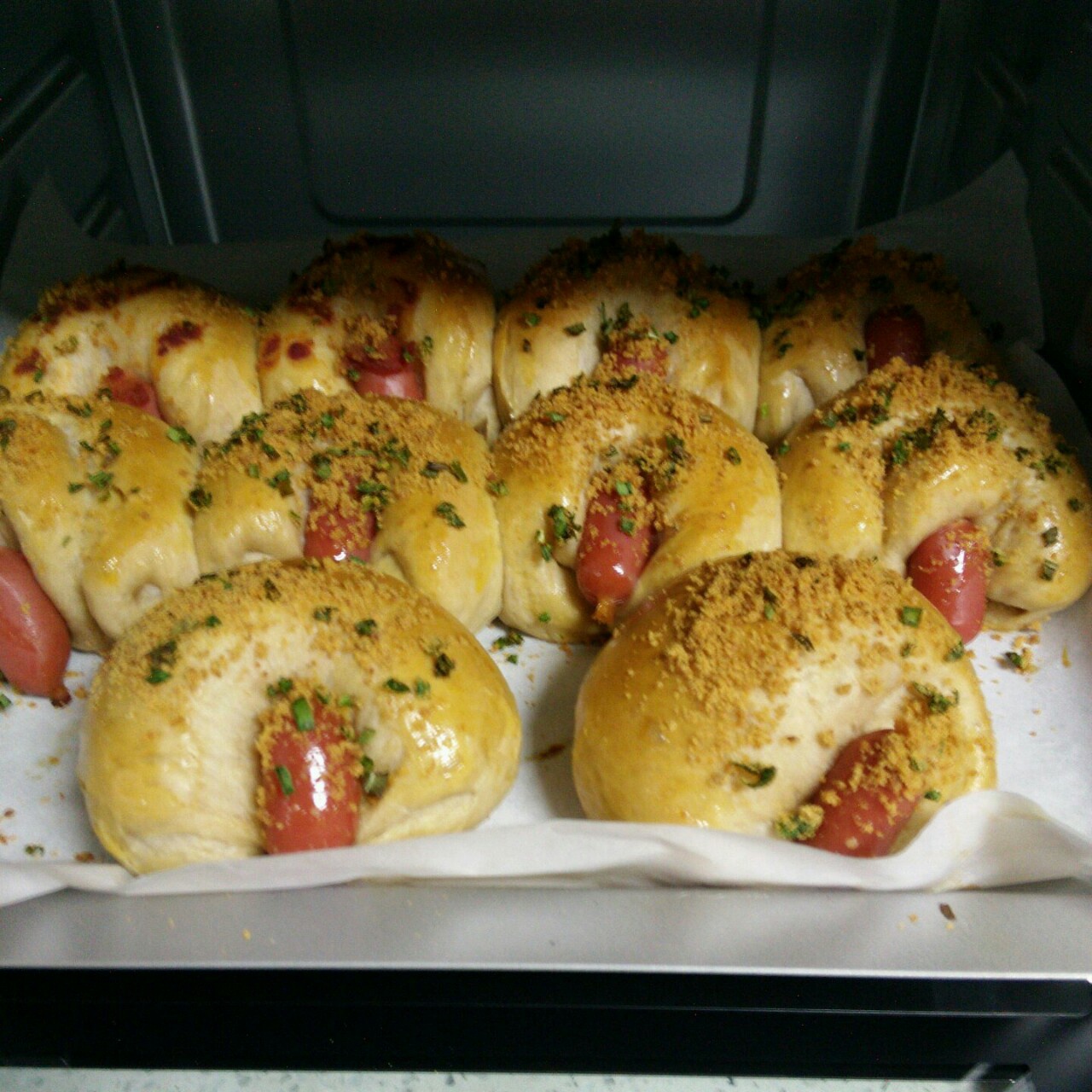 我是来毁菜谱的,没有披萨草用了香葱,挤了两个番茄酱发现丑到爆就在表面撒了肉松,还有你们的造型怎么这么好看,但是面包软的没话说,超好吃(๑• . •๑)