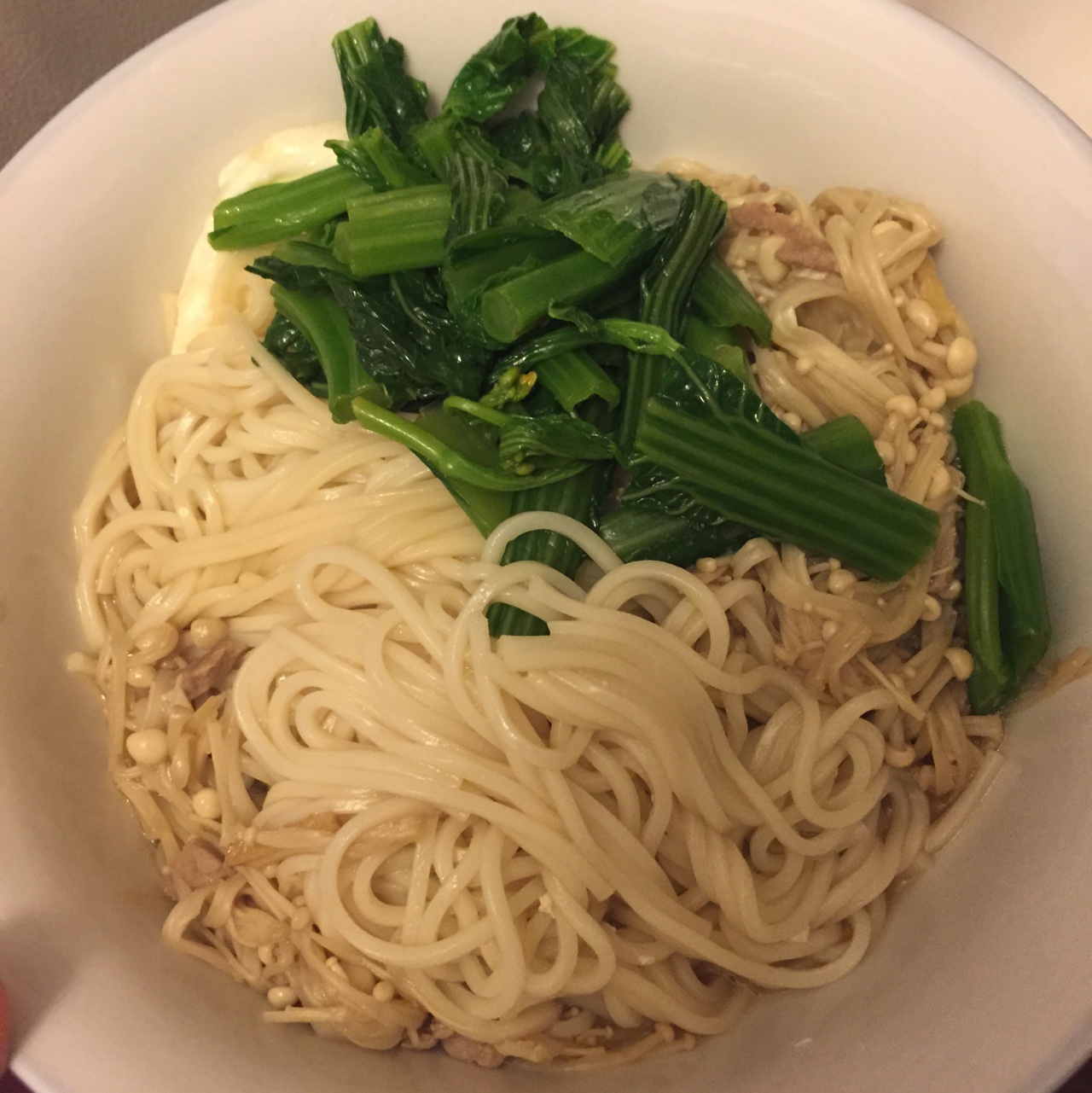 金针菇炒肉丝六月鲜伴油麦菜加鸡蛋盖面