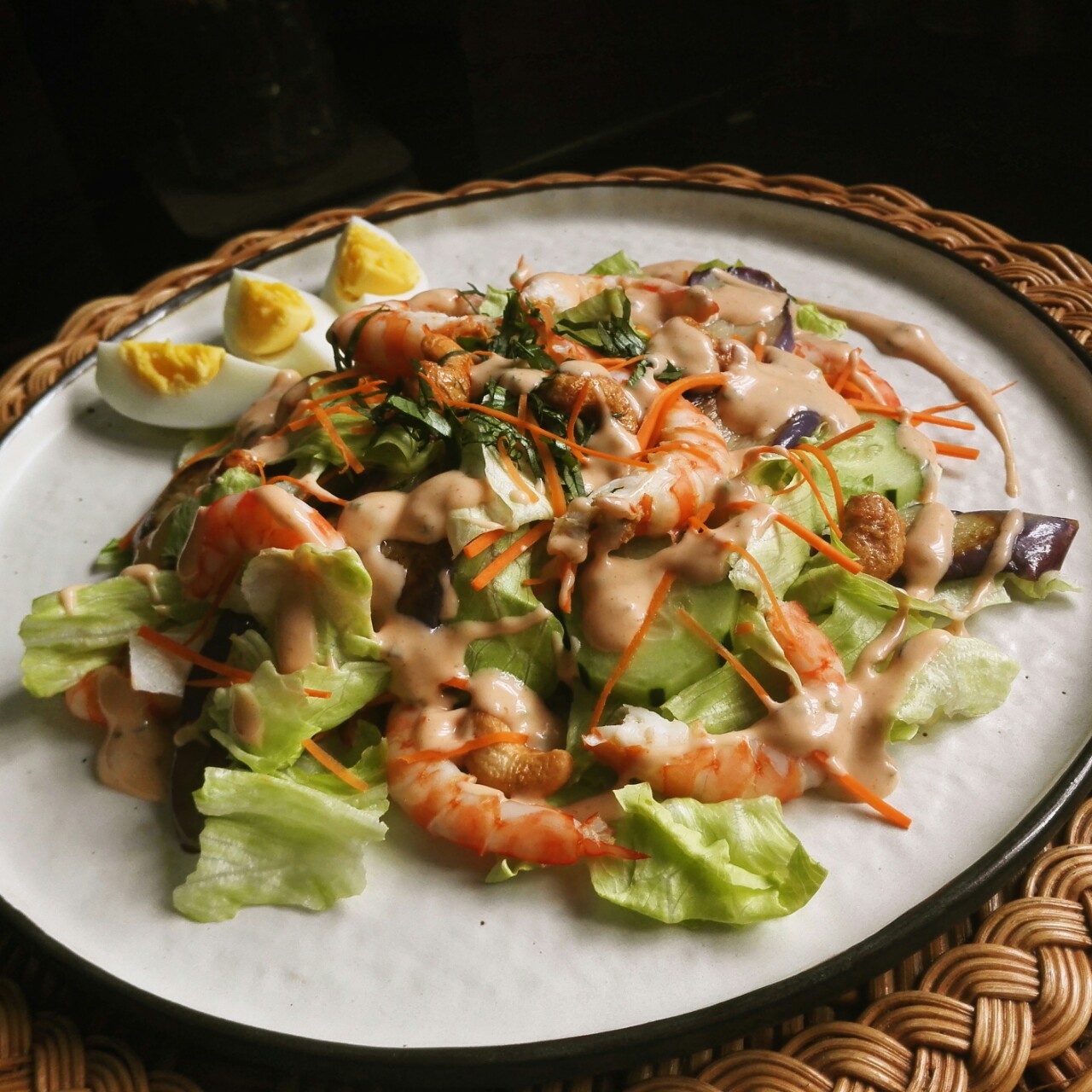 浇了酱汁的大虾salad