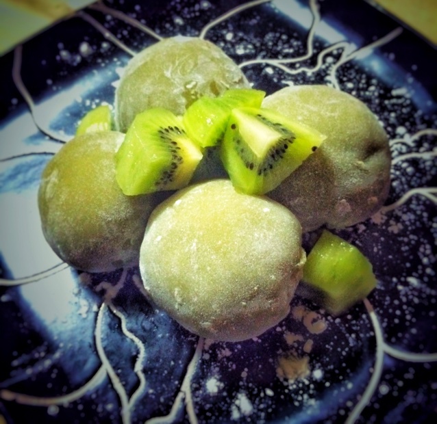 抹茶➕糯米➕牛奶做的外皮,超级好吃,但是好粘啊,现在没看见草莓卖就做了猕猴桃的。