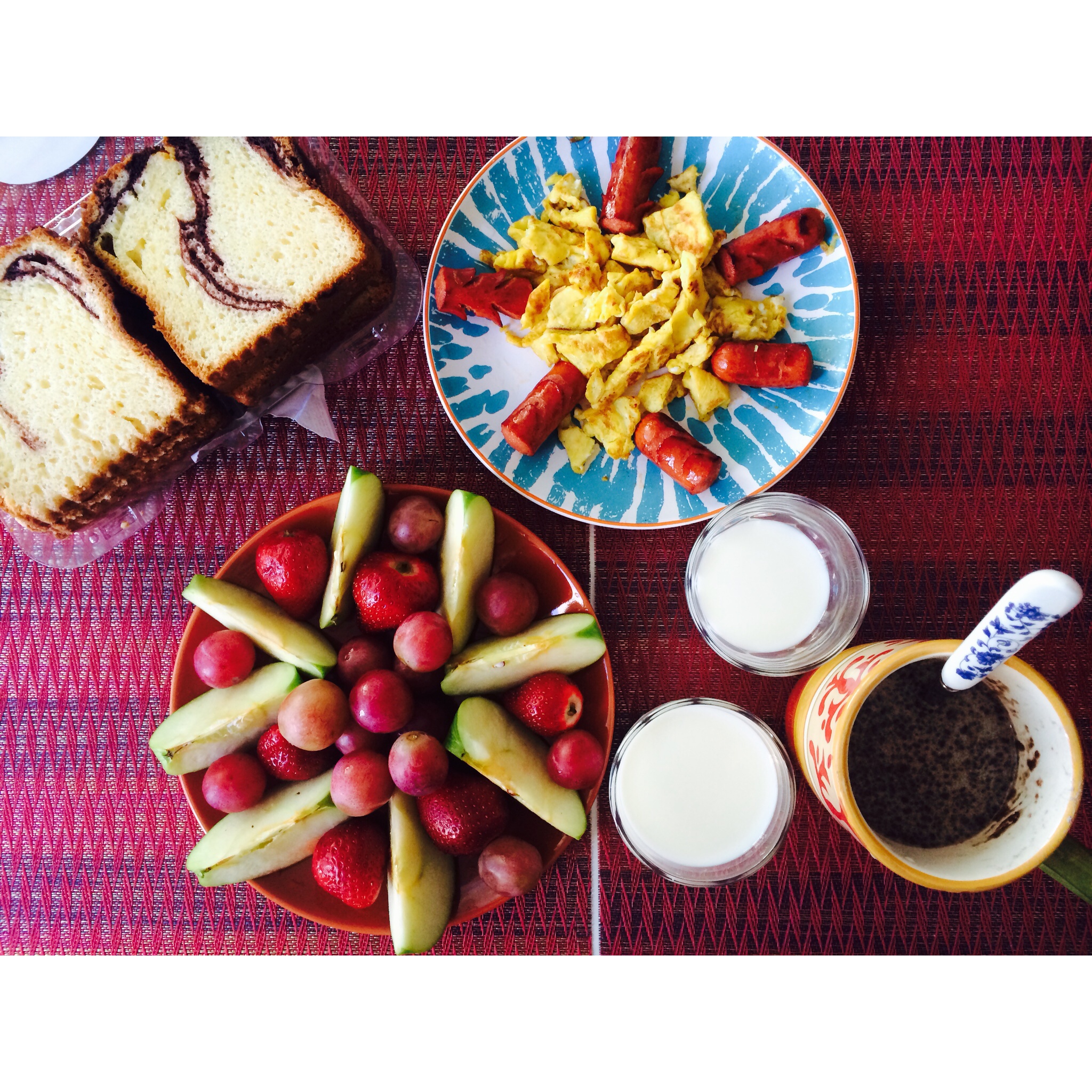 【炒蛋煎肠+水果+大理石蛋糕+牛奶=健康早餐】