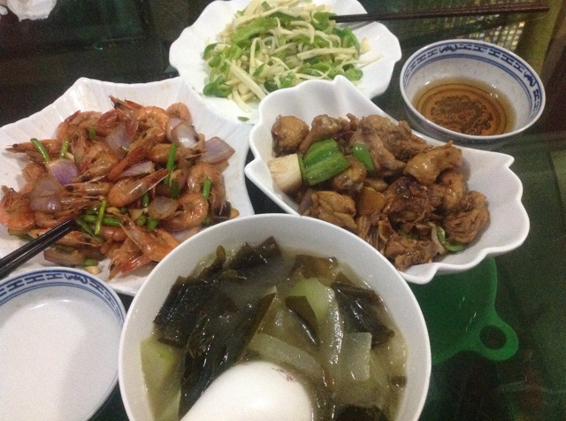 油爆虾,红烧鸡,清炒茭白丝,海带冬瓜汤。
