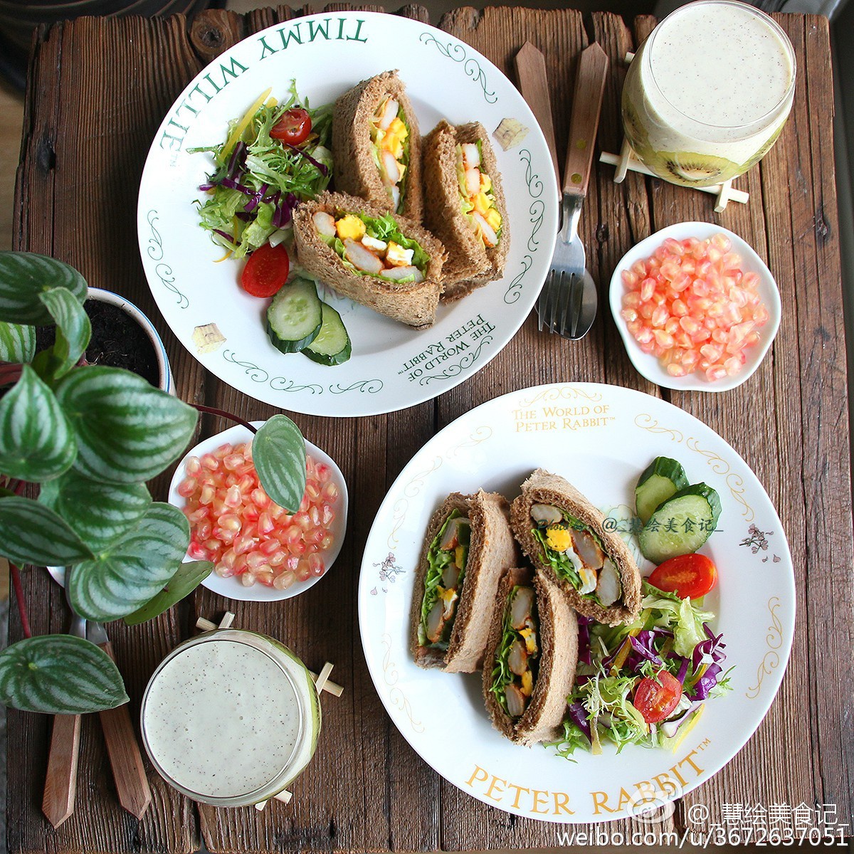 _慧绘美食记_ 做过 #我用早餐叫醒你# 黑麦口袋三明治、猕猴桃思慕雪、蔬菜沙拉、石榴~~ 切猕猴桃切出了心形的芯O(∩_∩)O~ #我用早餐叫醒你# #早餐•2015年10月9日# 2015-10-09