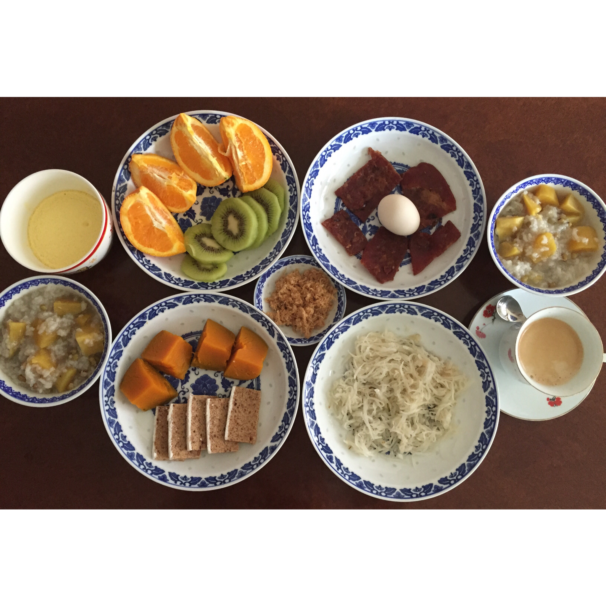 葱油萝卜丝、红薯粥、蒸南瓜、烤肉脯