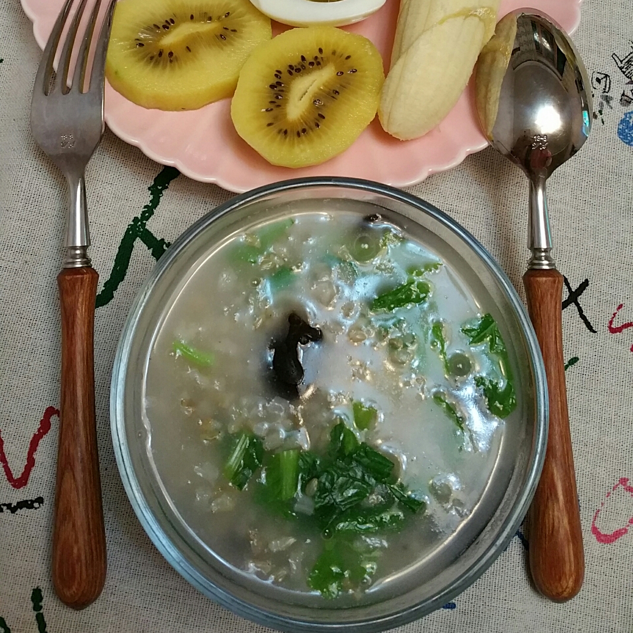 黑木耳蔬菜糙米粥, 玫瑰馒头,水果蛋! 早!