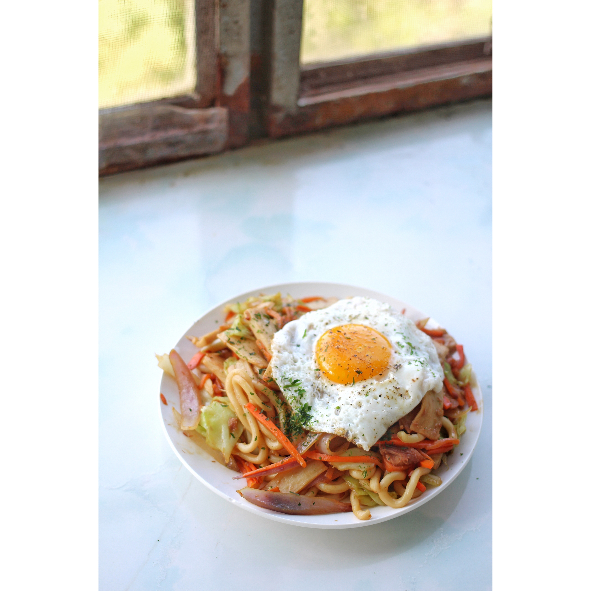 一人食,买的面还没有到呢,就炒了乌冬~最喜欢的炒面方子~最后撒了海苔末~