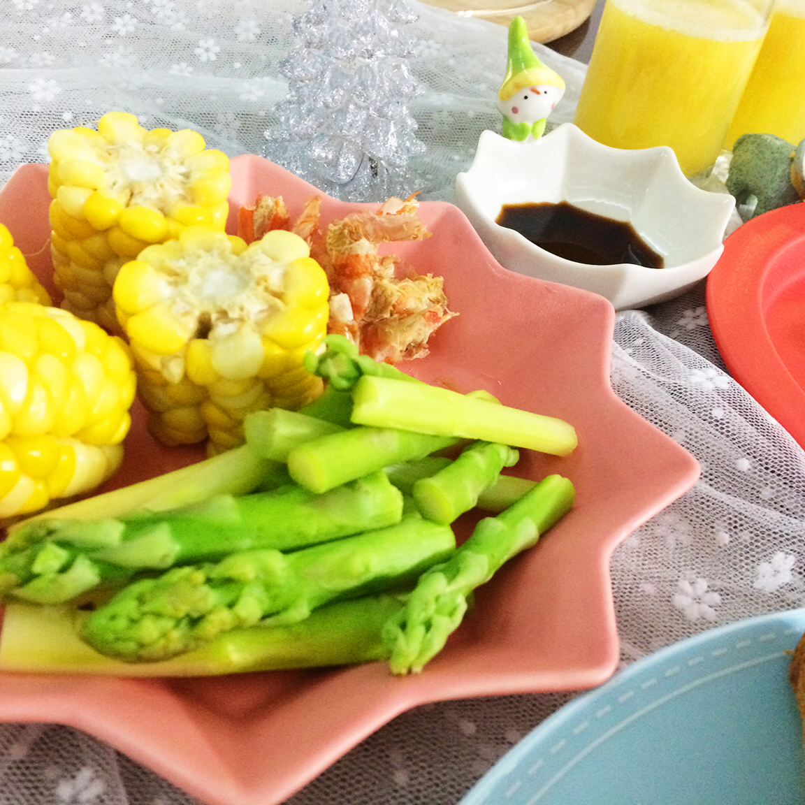 橙子苹果猕猴桃汁,水煮玉米、芦笋,冬日里的维生素