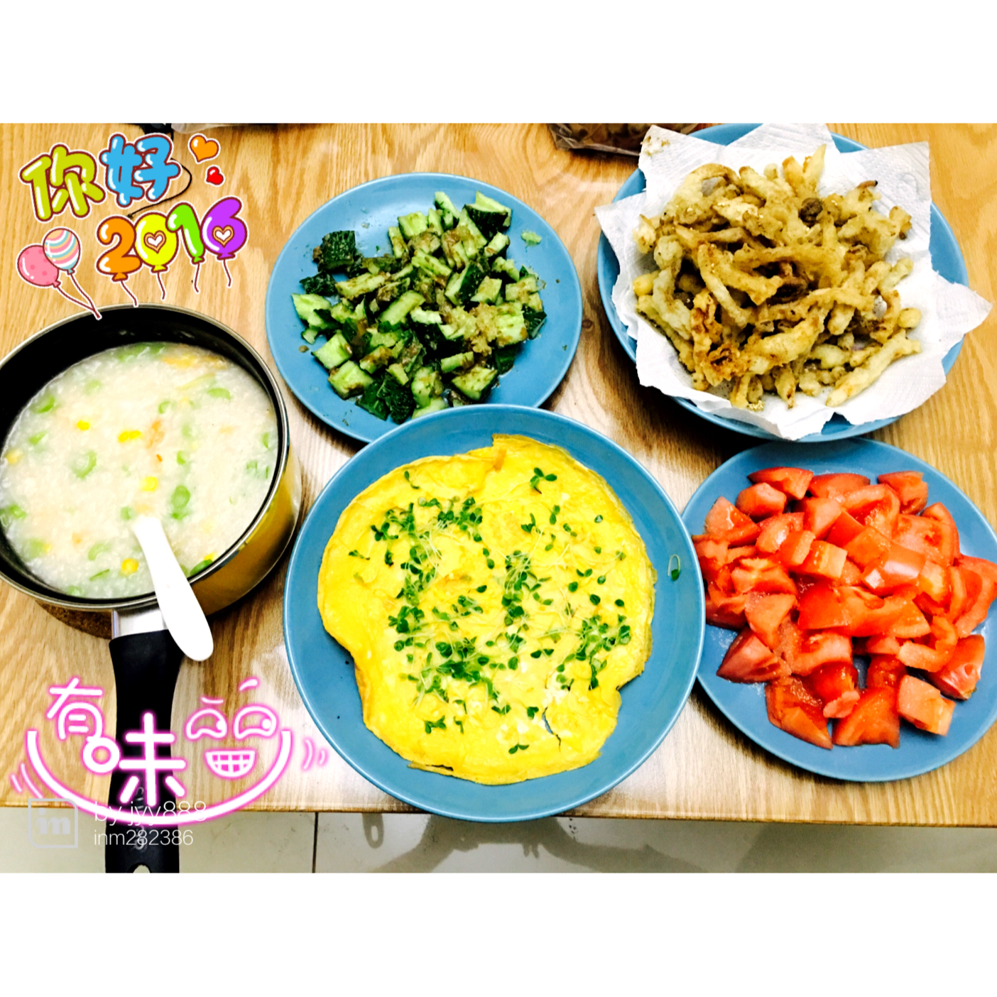 jyy-5 做过 晚餐•2016年1月2日 鲜虾干贝粟米粥+香椿芽蛋饼+椒盐蘑菇+麻酱黄瓜+砂糖西红柿。2016动手第一餐,很简单很平常也很合口味!😊 #晚餐•2016年1月2日# 2016-01-02