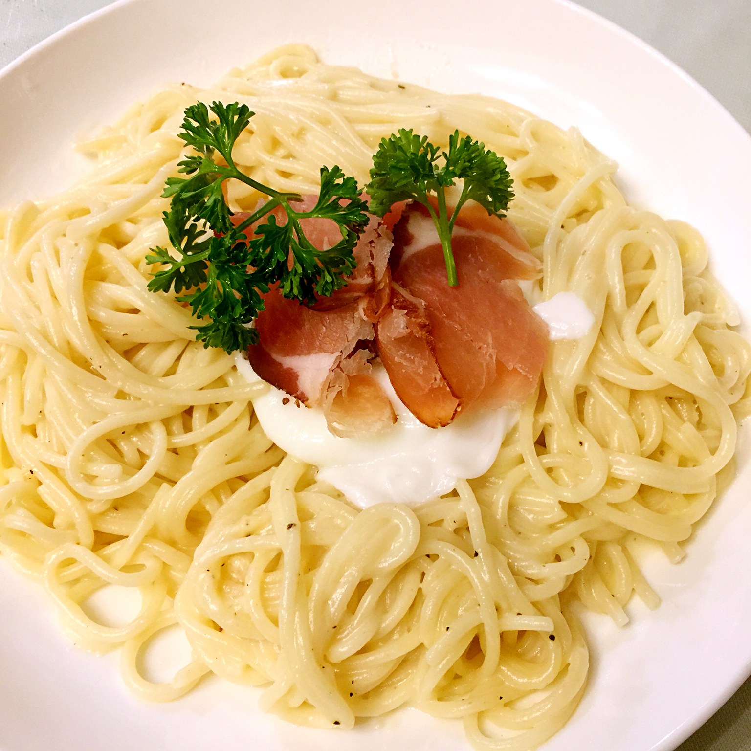 火腿水波蛋白汁意面