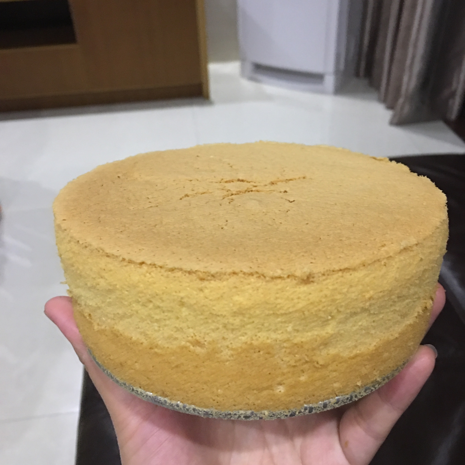 6寸用的两蛋,还是有点开裂,不过型像算很好了,主要是乳化那里做得仔细,吃完后感觉有点甜,怎么办呢