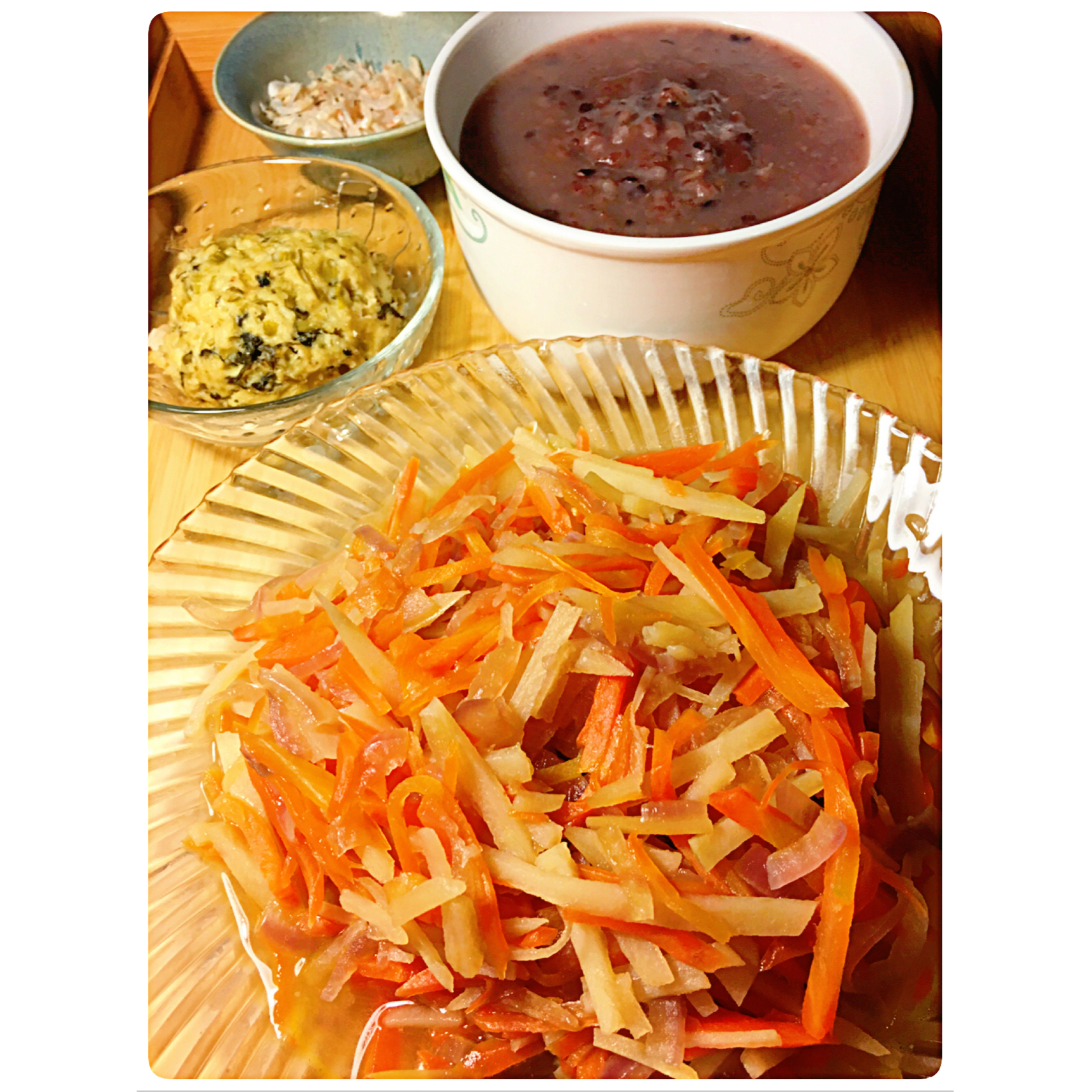 清风2015 做过 早餐•2016年1月15日 没睡好 有点睡眼惺忪 还好昨晚记得取出了冰箱冷冻的杂米粥 一根胡萝卜一个土豆半颗圆葱切丝 炒炒闷熟 少许盐调味儿 杂炒菜一盘伴杂米杂豆粥 再吃几口老妈实验的芹菜叶杂和面窝头 哈哈最近就是跟杂较上劲了~😄 #早餐•2016年1月15日# #随心所欲杂蔬杂炒# 2016-01-15