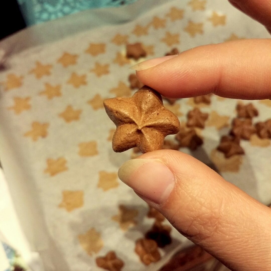 只有50蛋清,加了35的糖,可可粉玉米淀粉提前过筛混合一起下,完美!