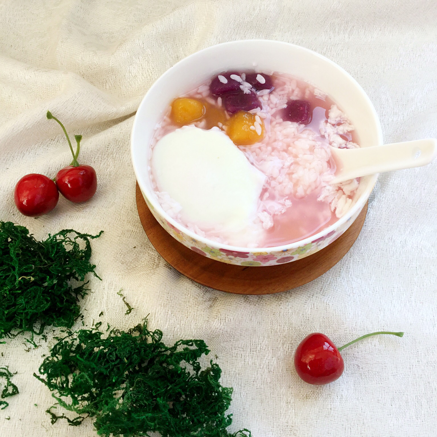 心安即是家 做过 芋圆酒酿水铺蛋 自制的紫薯芋圆和红薯芋圆,开水下锅,再轻轻敲入一个鸡蛋。火不要太大,保持蛋型完整。快好时加入酒酿,最美妙的时刻来了。紫薯含有花青素,原来的汤色是青绿色的,这时候马上变成淡淡的紫红色,非常漂亮。#芋圆酒酿水铺蛋# #午餐•2016年2月20日# 2016-02-20