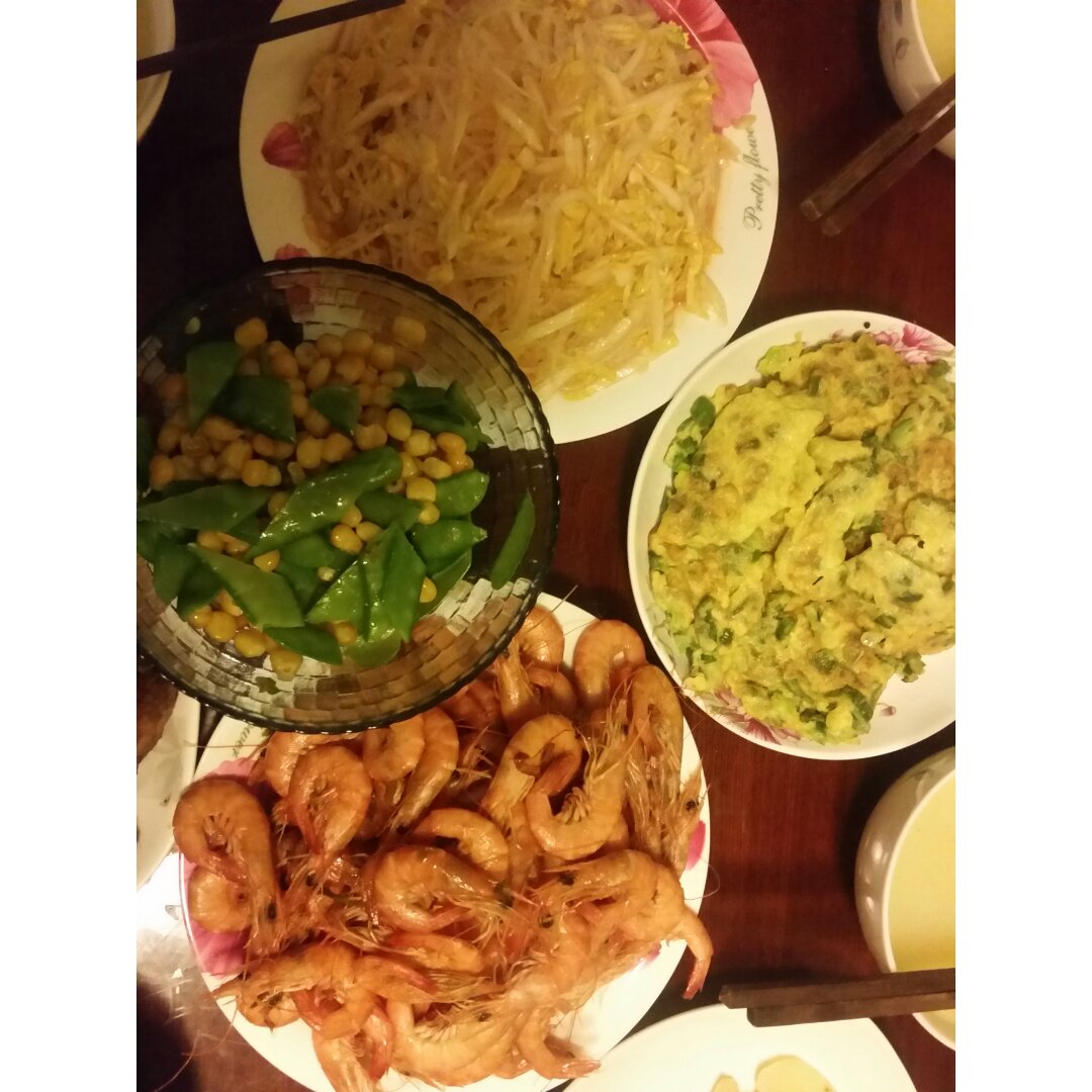 拌白菜丝+青椒炒鸡蛋+炒虾