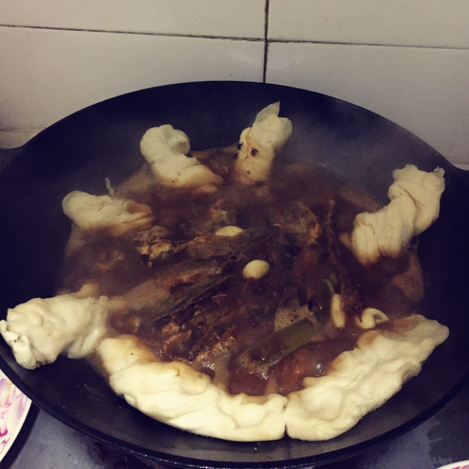 一锅出!家熬棘头鱼,锅边一圈花卷,其实最后还放了手撕白菜。再配一碗玉米粥,太满足了!