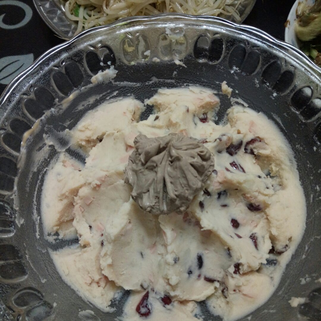 加了火腿肠和蔓越莓,还用了掉做蛋糕剩下的巧克力咸奶油,灰常美味!