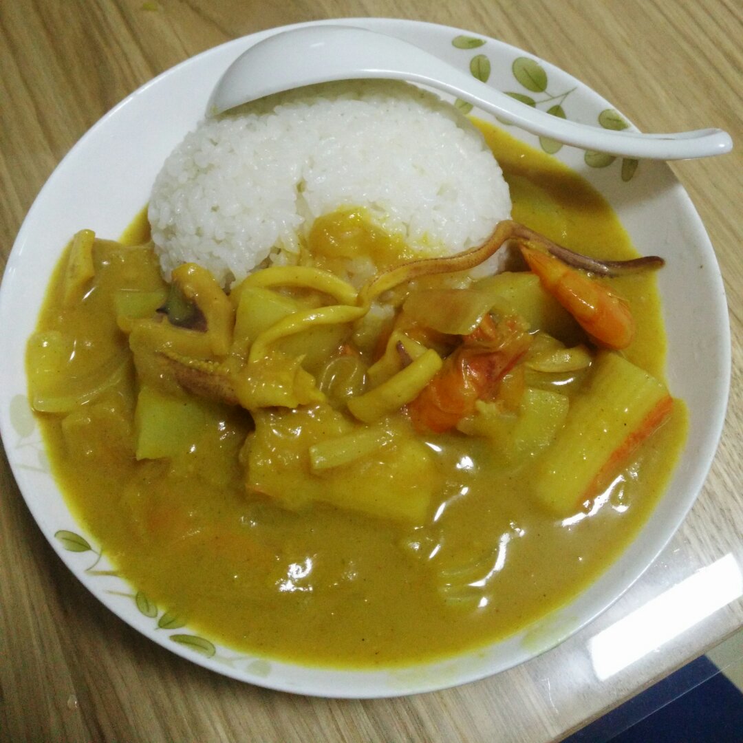 布头儿熊熊 做过 晚餐•2016年3月20日 #晚餐•2016年3月20日##清存货#清存货之海鲜咖喱。冰箱里的鱿鱼干,海虾,咖喱块,加一点洋葱土豆,就变成了美味又下饭的海鲜咖喱咯😍做的时候加一个苹果擦丝,再加一点牛奶,味道浓郁香甜😝再配一个蔬菜沙拉,完美的晚餐😘 2016-03-20