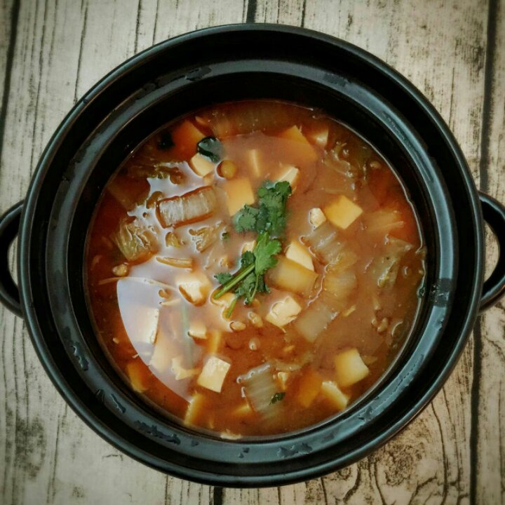 加了白菜、豆腐、金针菇,香菜叶子装饰点缀。