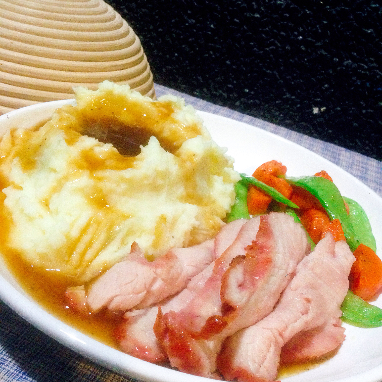 布先生半夜饿了,肉鸡土豆泥,黄油蔬菜以及叉烧😁