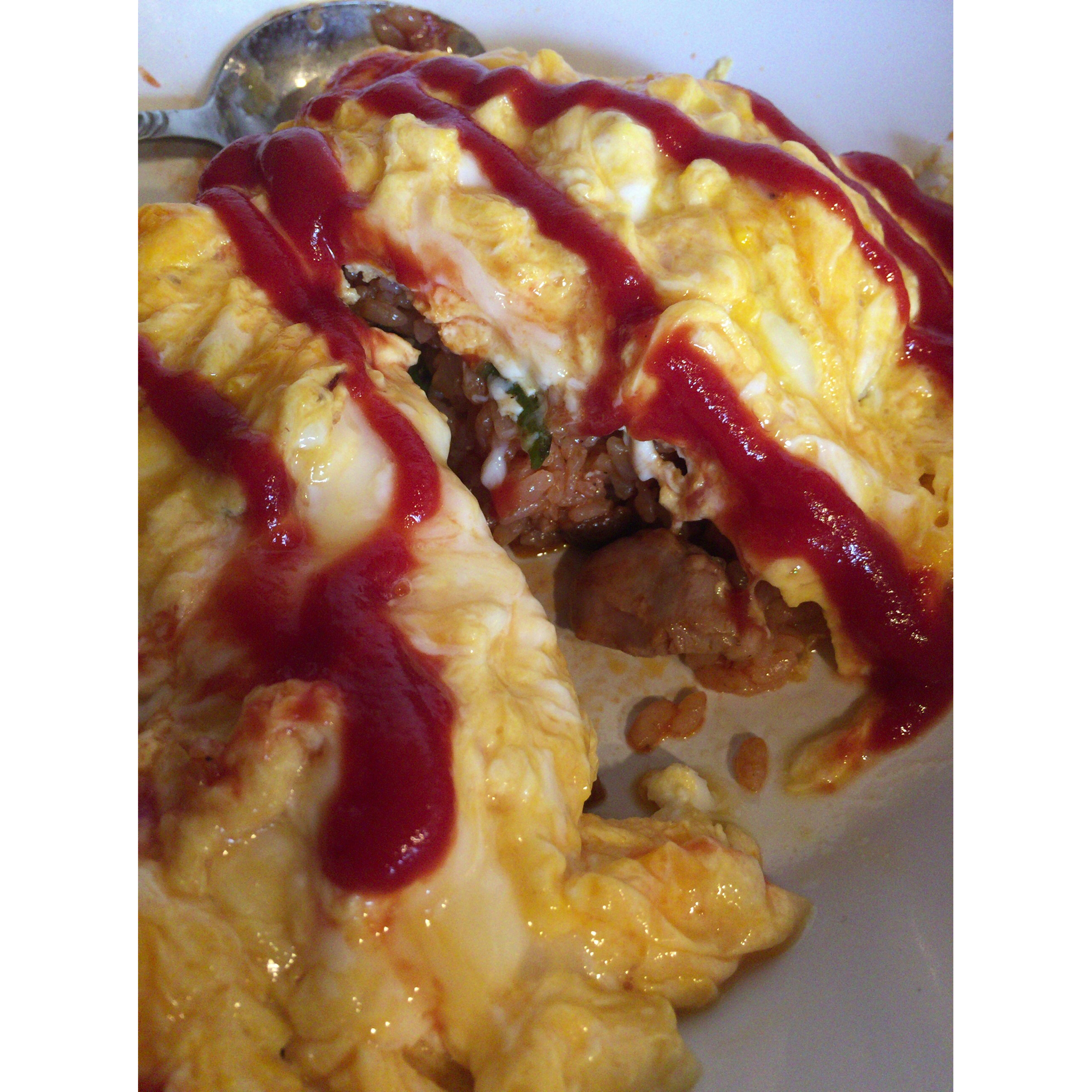 花酱hana 做过 午餐•2016年3月23日 蛋包饭,炒饭里放了小蘑菇,鸡肉,洋葱,青椒。然后蛋皮一定要是这种还没有完全发硬的。真的是太好吃了,好吃的不行不行!幸福幸福幸福💕 #午餐•2016年3月23日# 2016-03-23