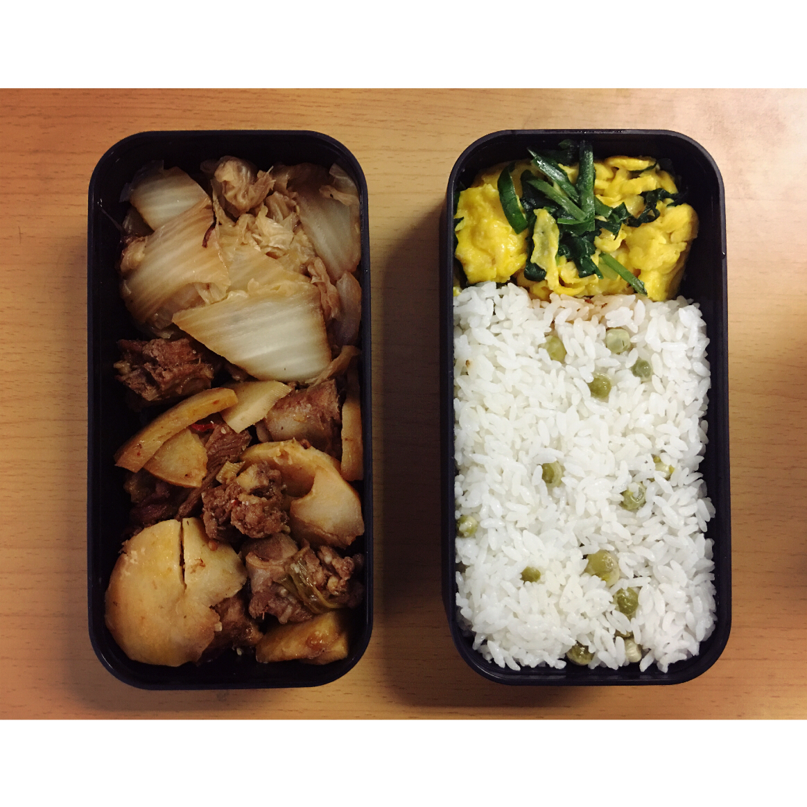 醋溜白菜 麻辣排骨 韭菜炒鸡蛋 青豆米饭
