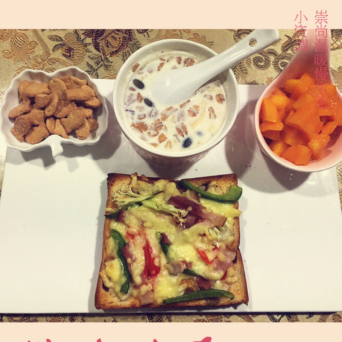 吐司小披萨+牛奶燕麦+小鱼饼干+芒果粒!营养即美味!