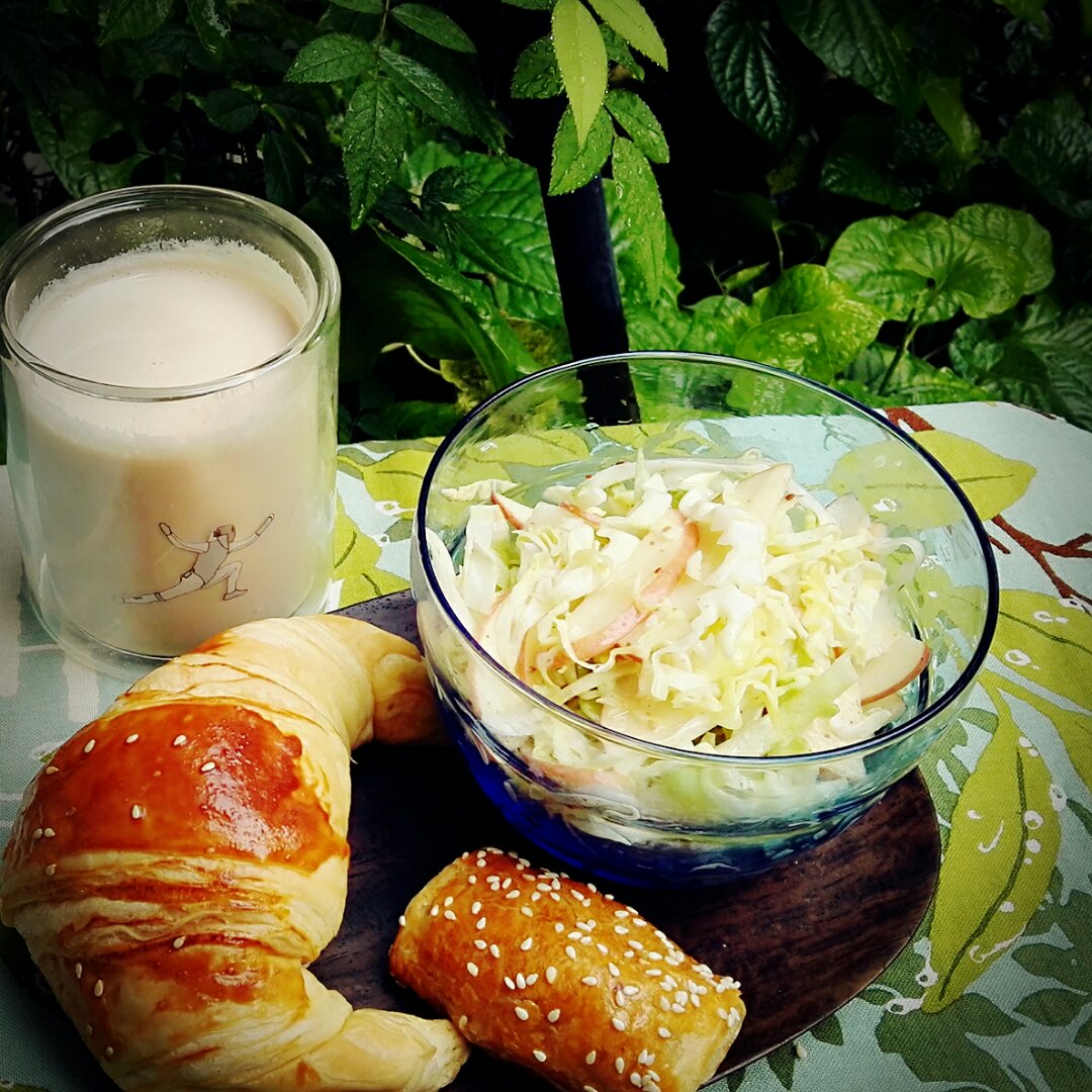 搭配卷心菜苹果沙拉、牛角包、叉烧酥。