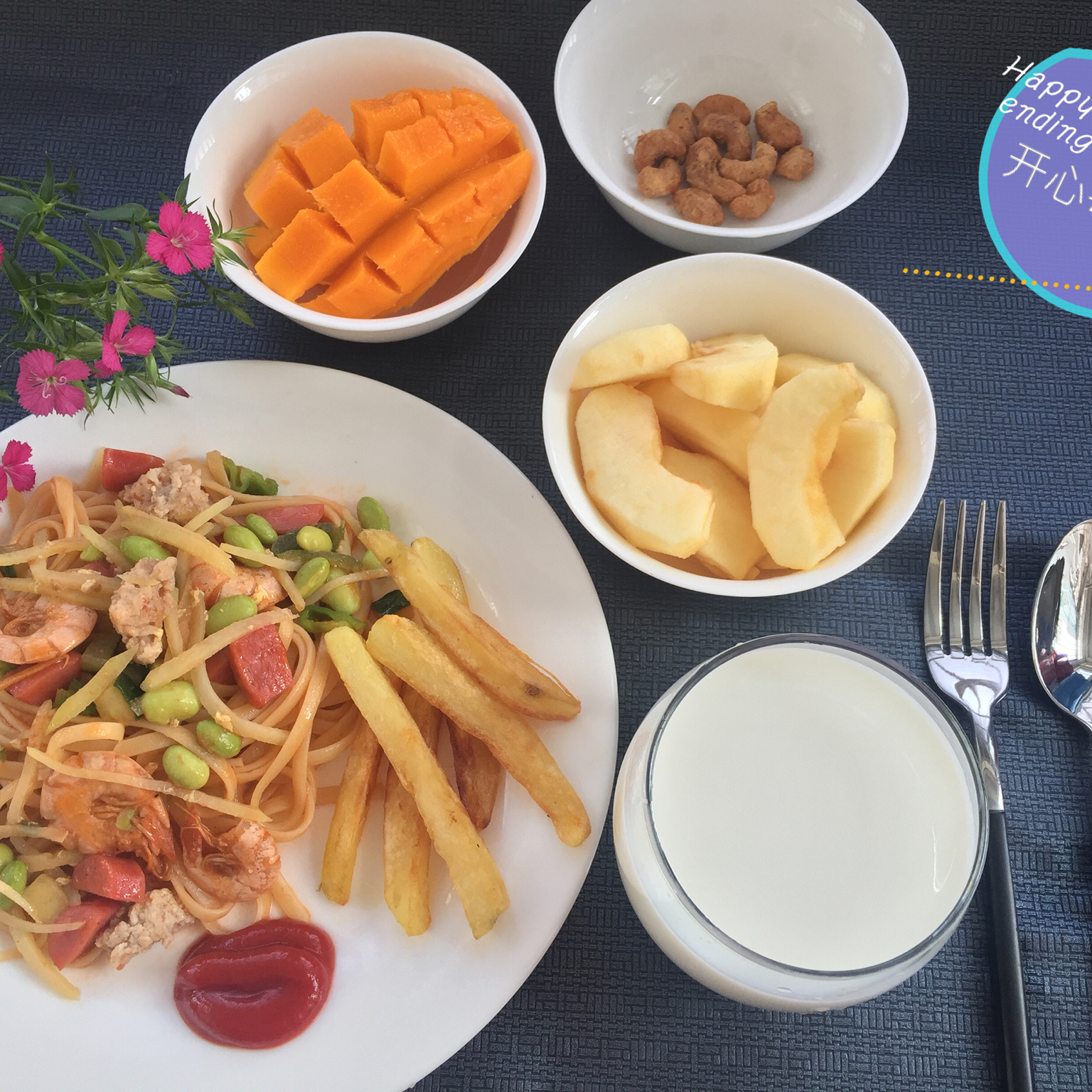 番茄虾仁意面,炸薯条!